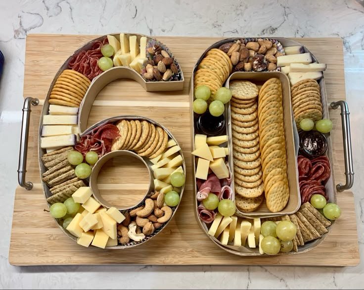 Delight your guests at a 60th birthday party with this ingenious charcuterie board, shaped like the number “60.” It’s a creative and delicious way to present appetizers, sure to be a conversation starter. This board makes snacking elegant and fun.