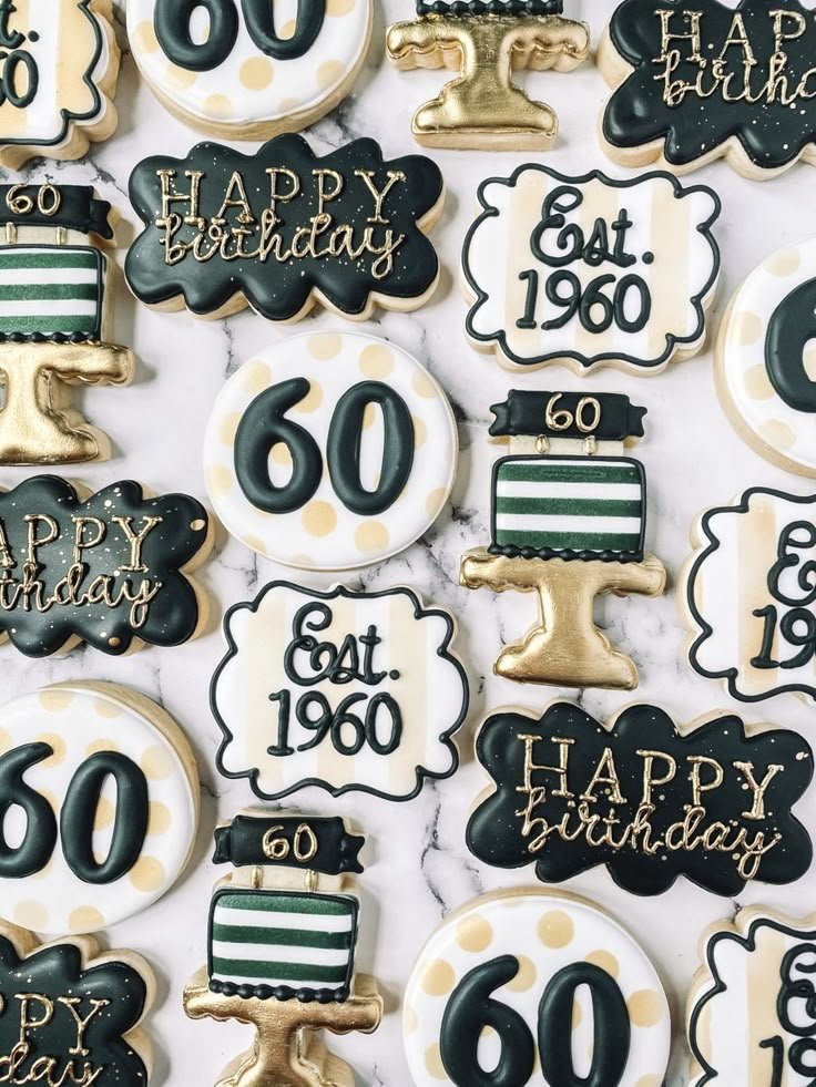 The collection features whimsical balloon shapes, elegant number “60” designs, and even miniature cakes, all adorned with intricate gold and black icing. The details are impressive, adding a touch of personalized sophistication. These cookies look almost too good to eat!