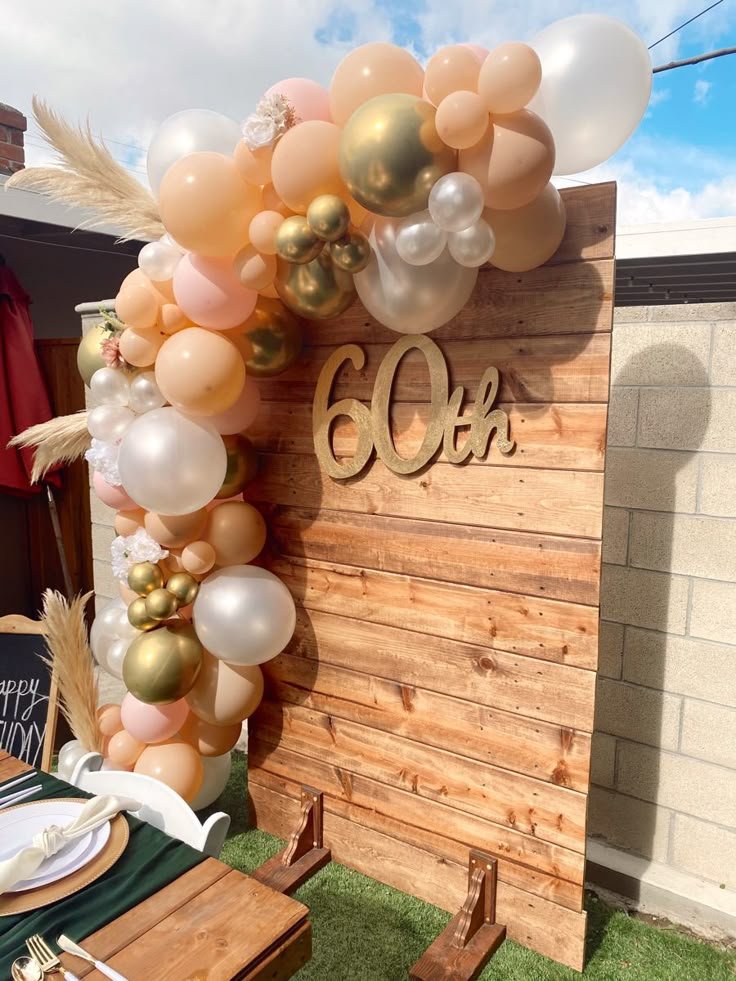 A stylish gold script reading “60th” is mounted on the wood, clearly marking the special occasion. This setup beautifully blends natural elements with celebratory flair, embodying unique 60th birthday ideas. It’s a picture perfect setting for a joyous milestone.