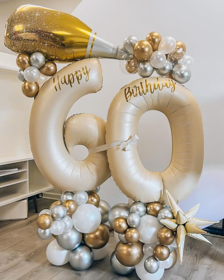 Mark a 60th birthday with a grand statement. This impressive balloon display features large, celebratory “60” numbers in a sophisticated champagne hue. It instantly sets a festive and elegant tone for any birthday gathering.