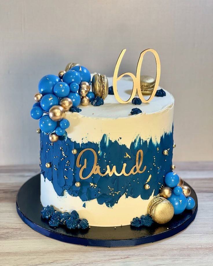 The cake features artistic blue brushstrokes and delicate gold splatters, giving it a modern and elegant feel. Clusters of vibrant blue spheres and golden macarons add playful texture and a touch of luxury. Golden “60” toppers proudly mark the milestone.