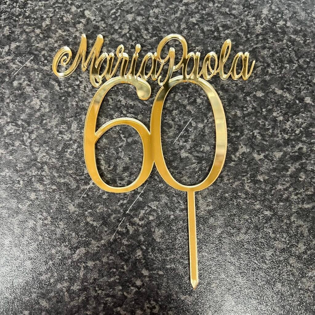 Featuring the milestone number “60” in a stylish font, this topper also includes the honoree’s name, “Maria Paola,” in a beautiful script. This personalization makes the cake truly unique and special. It’s a wonderful keepsake after the party.