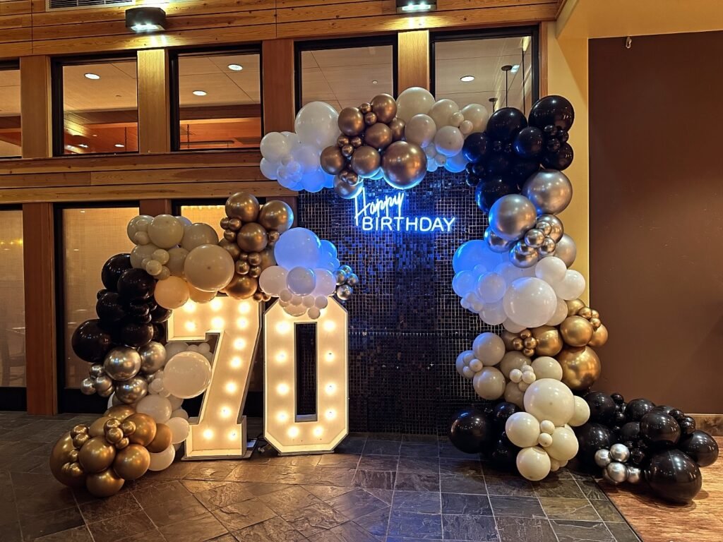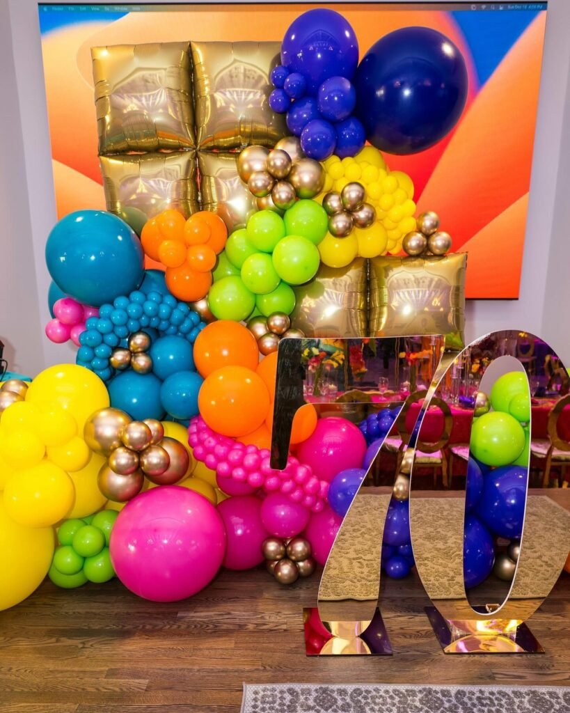 Who says 70th birthdays can’t be bold and colorful? This vibrant rainbow balloon display brings joy and energy to any celebration space.