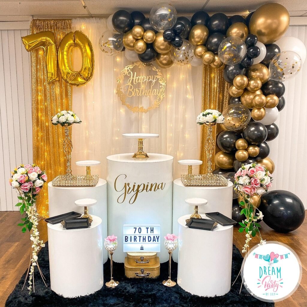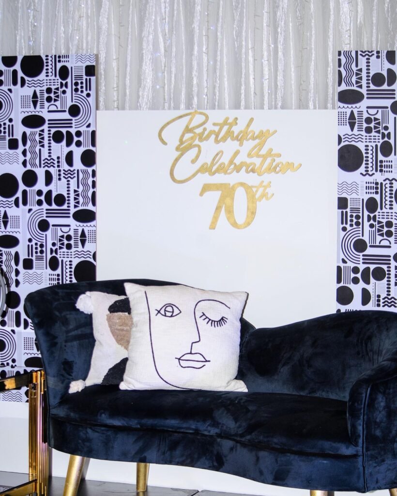The white curtain backdrop with subtle sparkles creates an elegant foundation, while the geometric black and white pattern adds contemporary flair. The gold “Birthday Celebration 70th” lettering strikes the perfect balance between modern and celebratory.