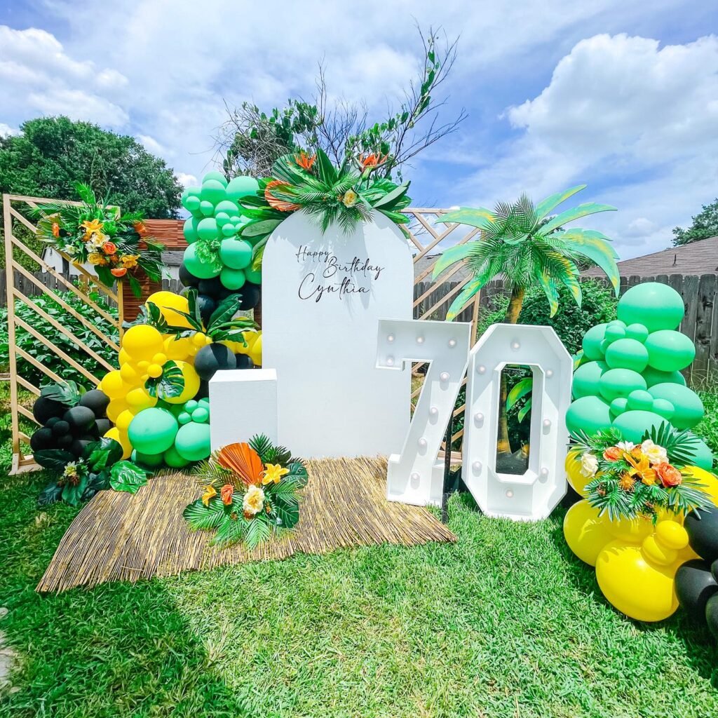The “Happy Birthday Cynthia” sign nestled among the greenery adds a personal touch, while the large illuminated “70” numbers make the milestone age the star of the show.