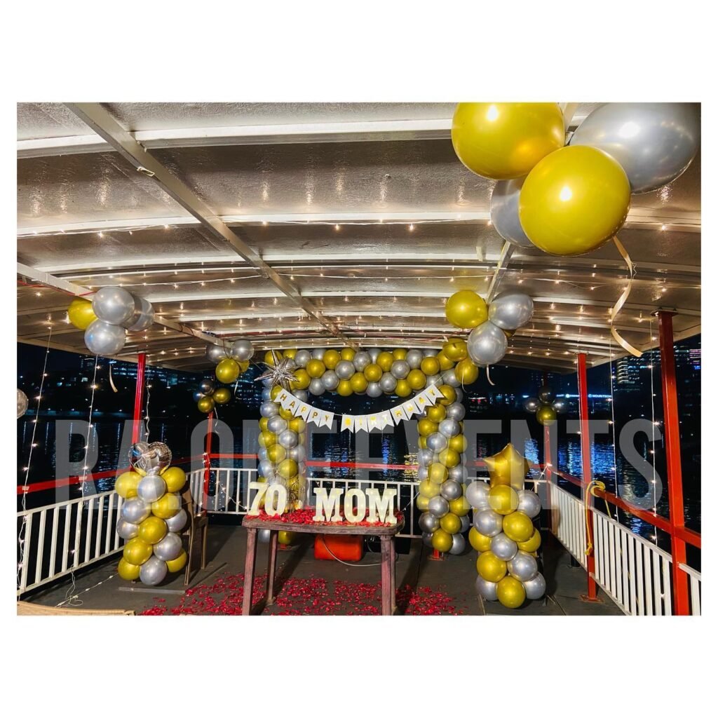 The yellow and silver balloon arch creates a stunning backdrop against the water, while the “70 MOM” lettering ensures everyone knows who the star of the show is. Red rose petals scattered on the deck add romance and elegance, proving that milestone birthdays deserve milestone celebrations.