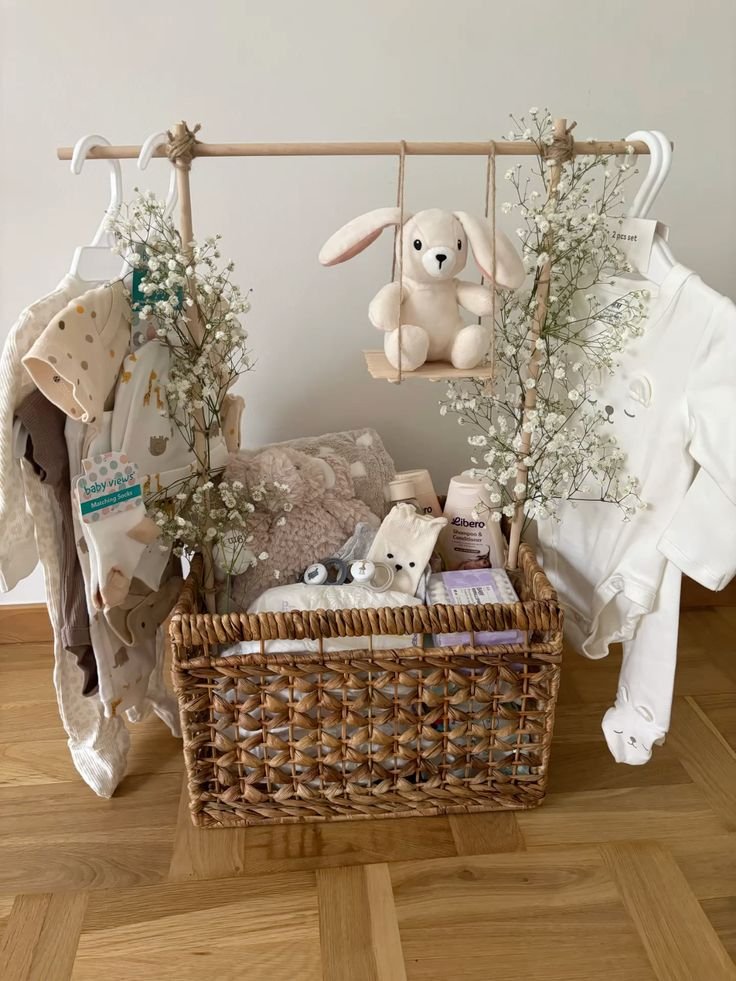 The woven basket is full of essential items. A soft bunny on a swing and delicate baby’s breath add to the whimsical look. The tiny clothes hanging on the rack are adorable.
