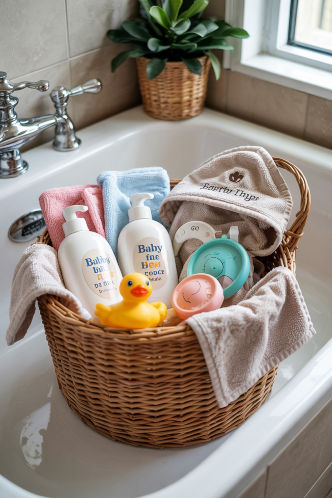 A bath time basket is filled with gentle, baby-safe bath products. I usually toss in baby shampoo, a mild body wash, and a soft hooded towel.