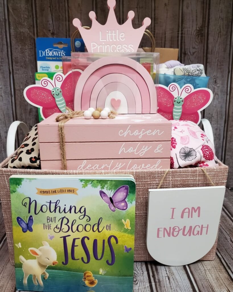 This is a beautiful baby shower gift basket idea for a little girl. It features a charming theme of butterflies, rainbows, and inspirational messages. The soft pink tones create a serene and loving feeling, making it a truly heartfelt present for new parents.