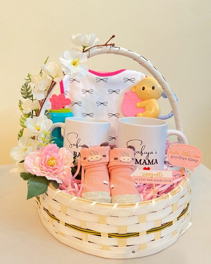 The highlight is the pair of personalized mugs. One says “Safiya’s MAMA,” and the other “Safiya’s PAPA.” It also includes playful baby items like a teether, a bib, and adorable baby socks.
