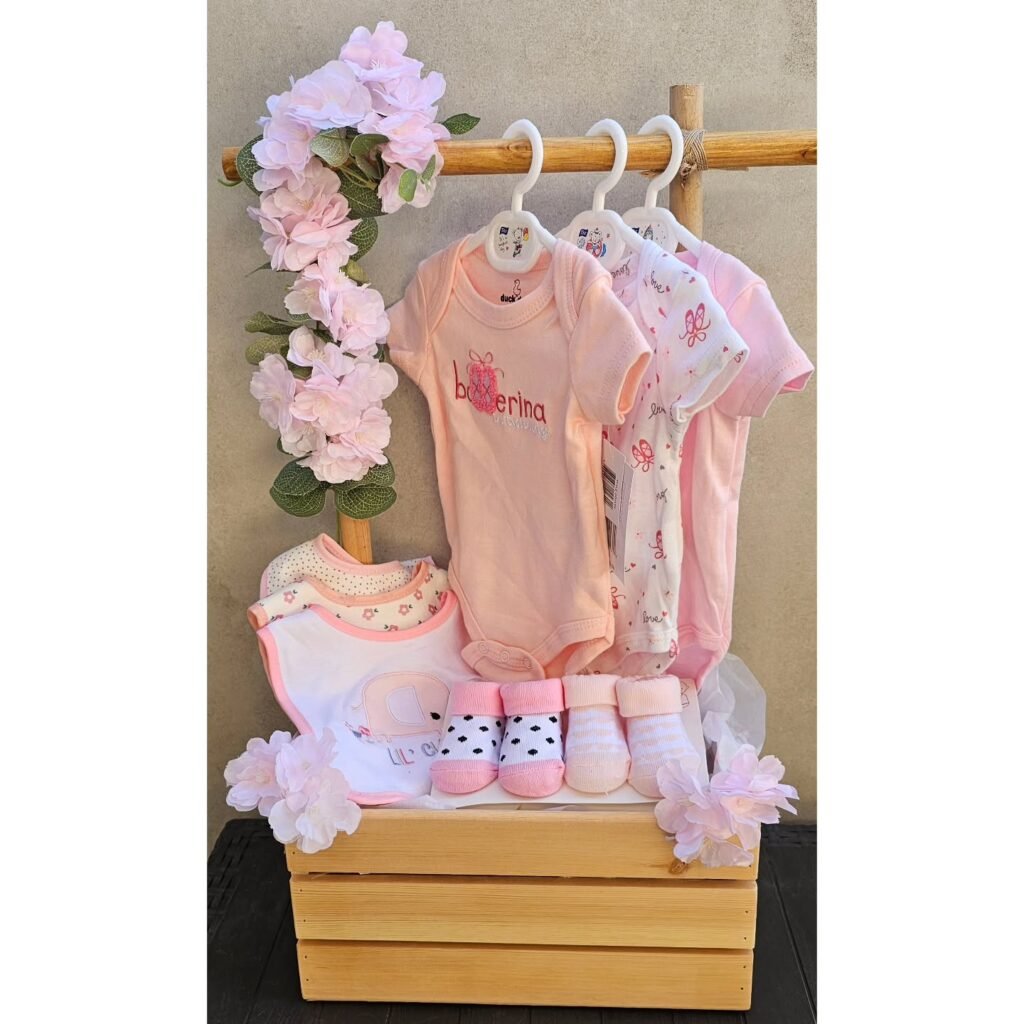 This charming wardrobe is a lovely baby shower gift basket idea for a baby girl. It’s a delightful display of pink and white outfits, all organized neatly on tiny hangers. The decorative pink flowers add a soft, elegant touch to the whole setup.