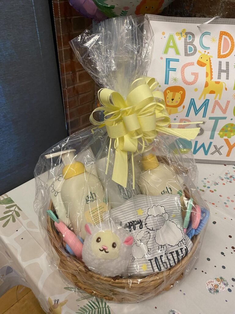 This basket is a wonderful baby shower gift basket idea for any new parent. It’s a practical collection of newborn essentials, carefully put together in a charming woven basket. The clear wrapping and soft yellow ribbon give it a clean, polished look.