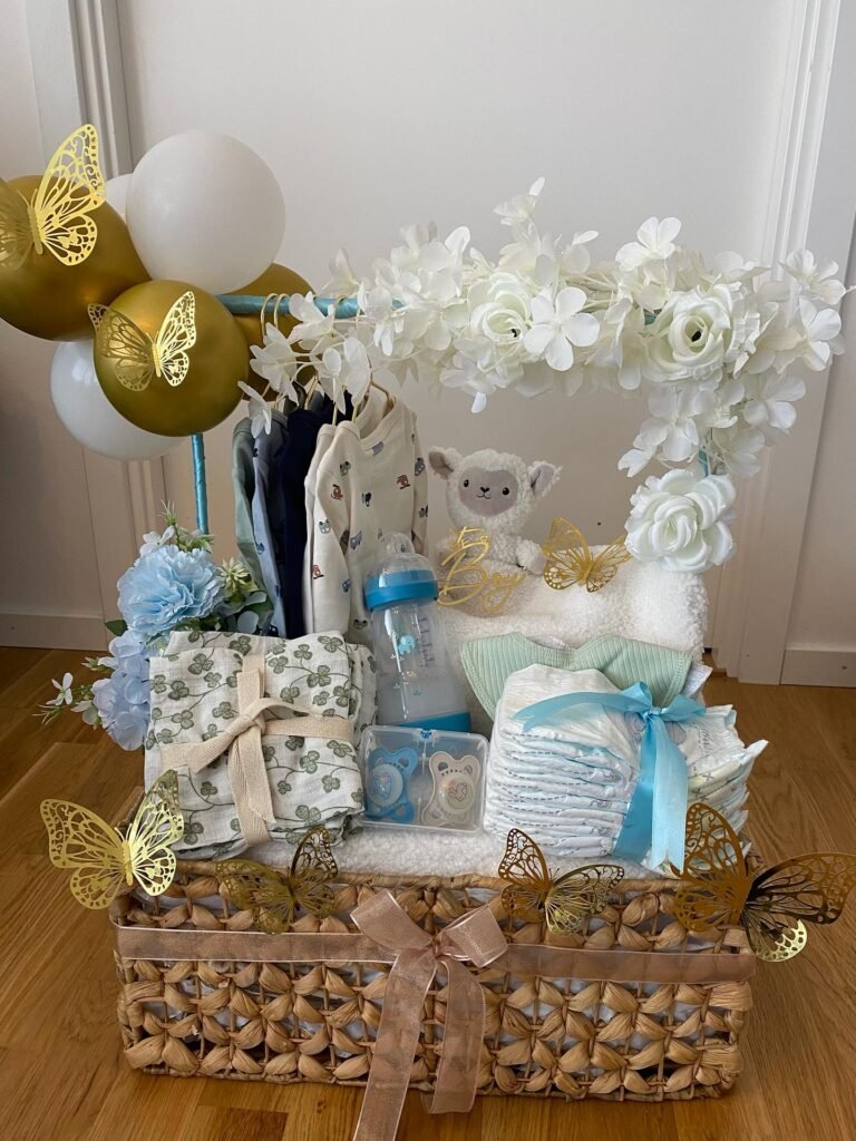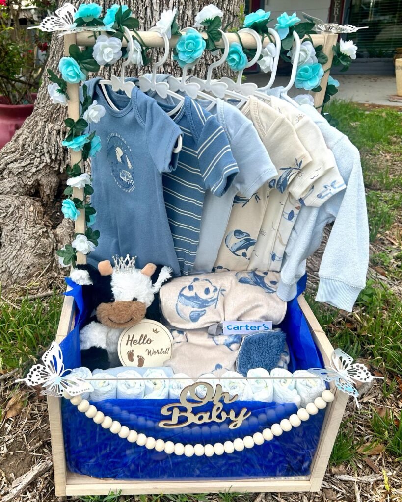 This is a spectacular baby shower gift basket idea for a newborn boy. It features an array of baby clothes and essentials beautifully displayed on a miniature rack and in a charming white wooden crate. The blue balloons and baby’s breath add a celebratory and festive touch.