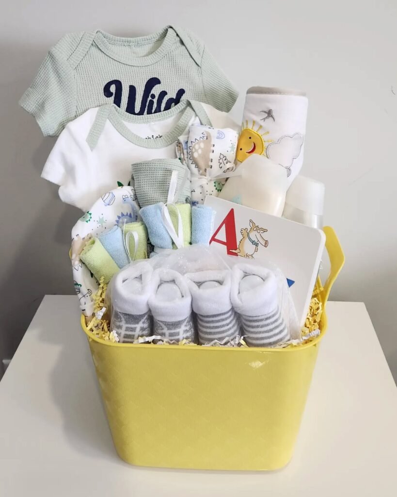 This cheerful yellow basket is a practical baby shower gift basket idea. It’s filled with a mix of essential items in a clean, gender-neutral palette. The variety of onesies and blankets makes it a great starter set for any new parent.