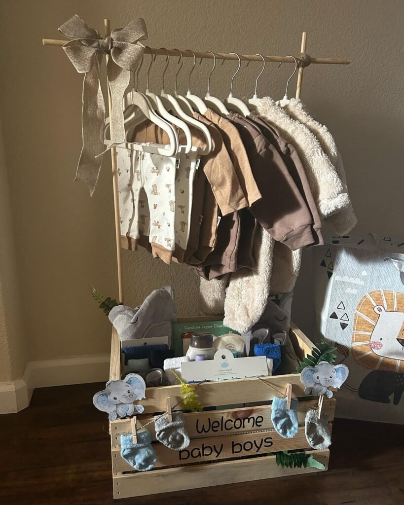 This charming wardrobe wagon is a fantastic baby shower gift basket idea. It features a collection of adorable neutral outfits, thoughtfully displayed on tiny hangers. Parents will adore this practical and stylish present.