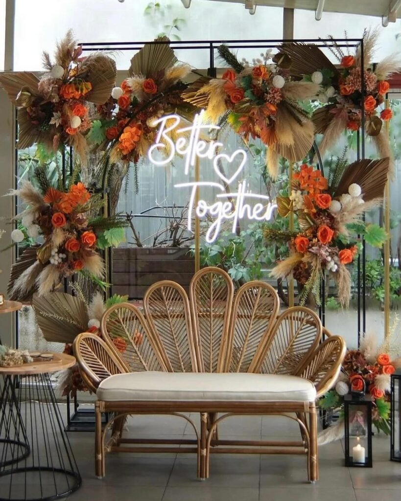 That “Better Together” neon sign is absolutely perfect – modern yet romantic at the same time. The mix of pampas grass and fresh flowers gives such beautiful texture and movement to the whole display.