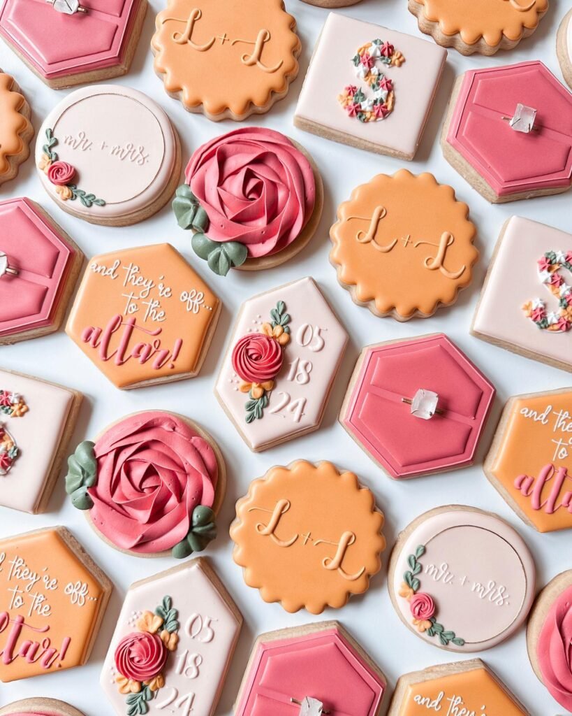 The intricate designs and delicate color palette make them look like tiny works of art. From “She Said Yes” to the wedding date cookies, each piece tells part of their love story.