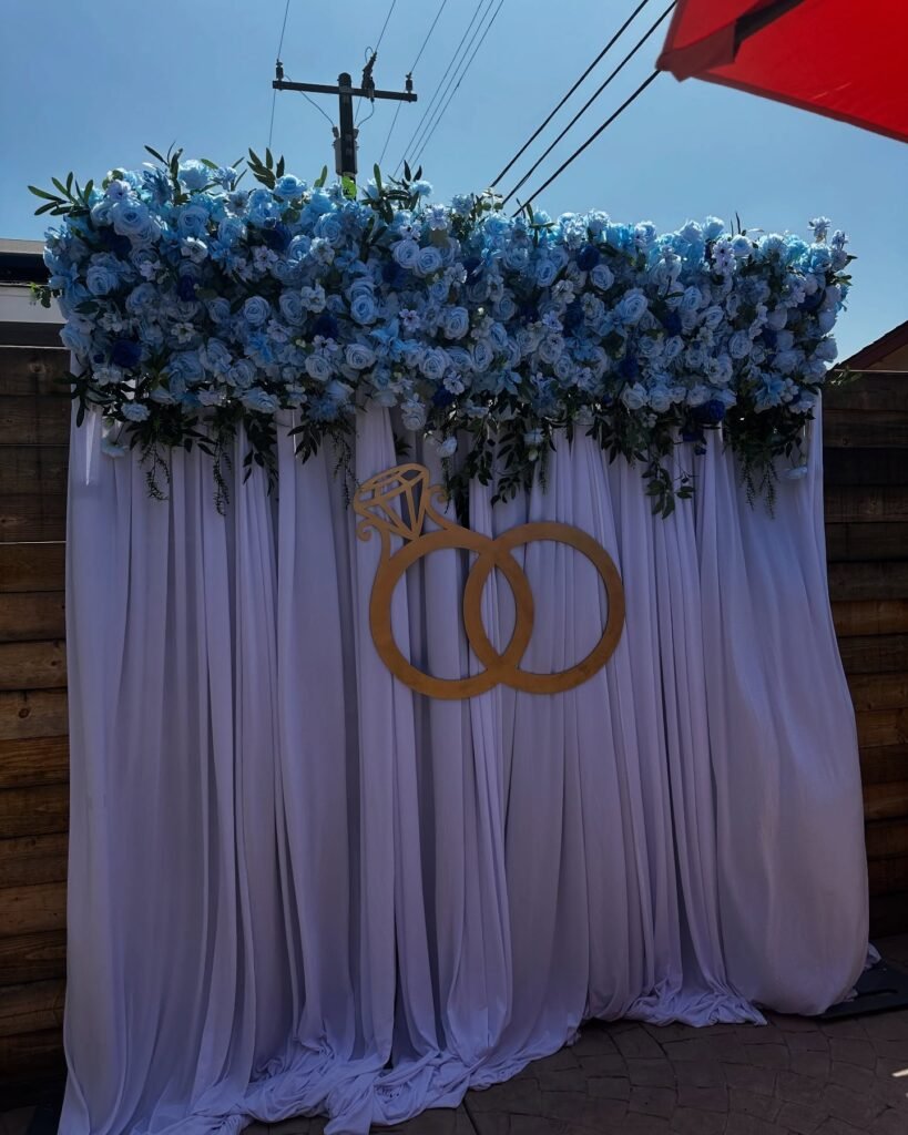 This gorgeous backdrop screams pure romance with its flowing lavender drapes creating the perfect photo moment. The abundance of blue and white flowers cascading overhead gives such an ethereal garden party vibe.