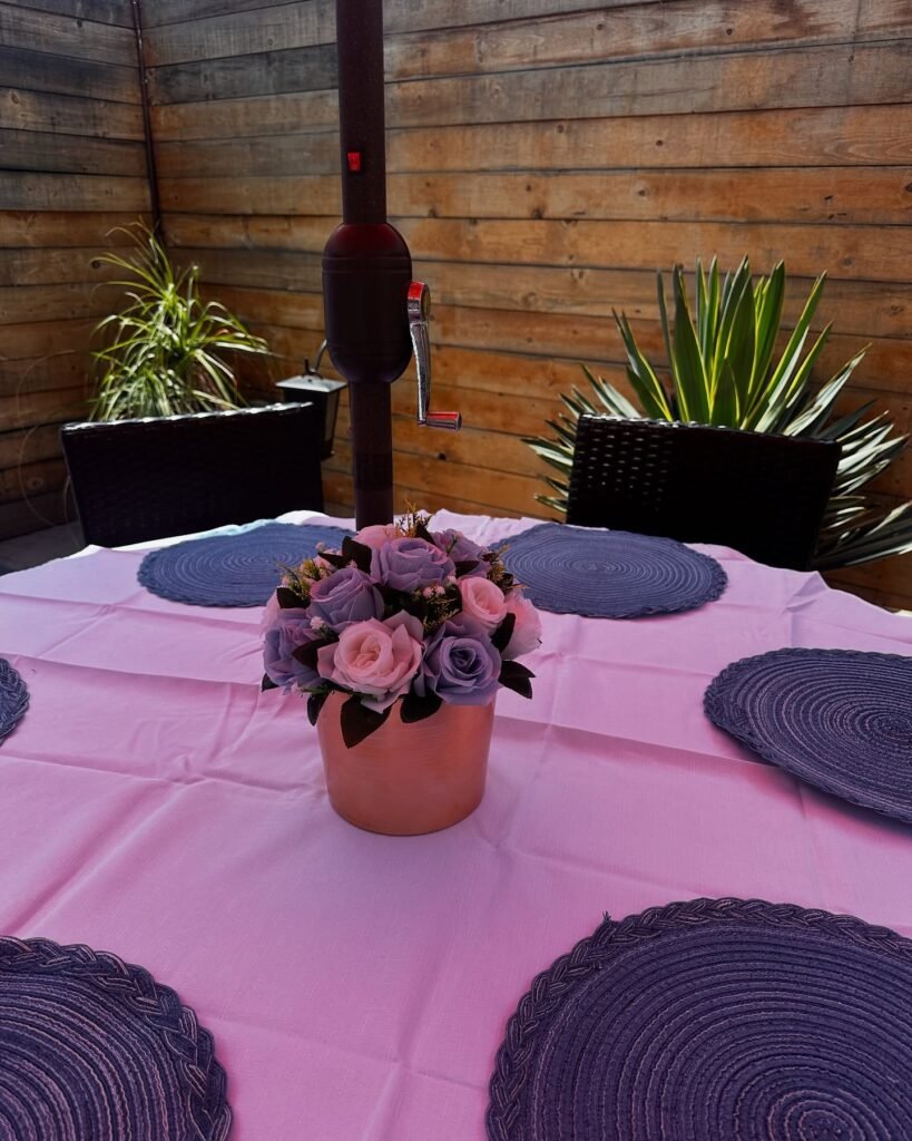The purple table runner paired with those woven placemats gives off such relaxed, bohemian vibes. Fresh flowers in terracotta pots keep things simple yet elegant.