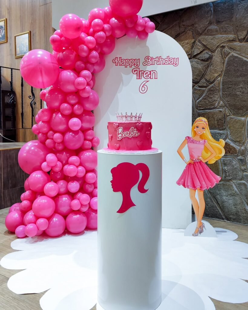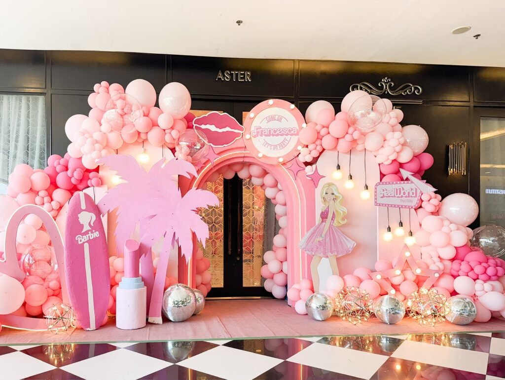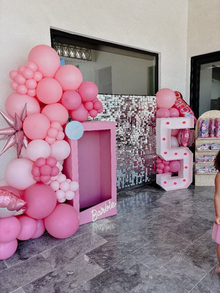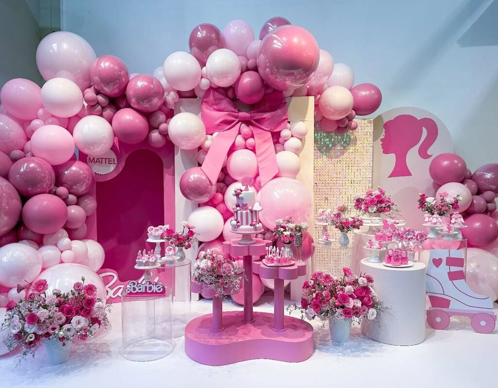 A customized Barbie box, ready for photos, is a highlight. Balloon garlands in various shades of pink frame the backdrop, adding a soft and voluminous touch to the display.