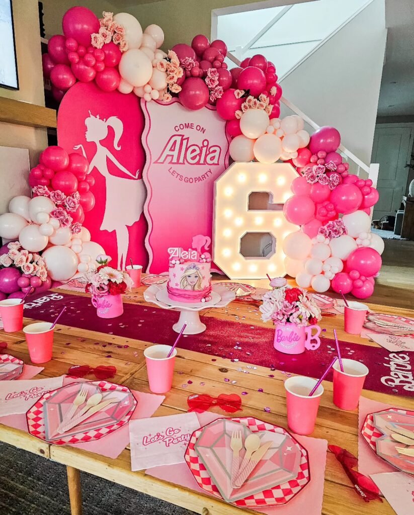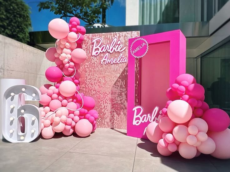 A large, light-up number six and a custom Barbie-themed backdrop anchor the display. Balloon garlands in various pink shades and white add a dramatic, festive flair to the background.