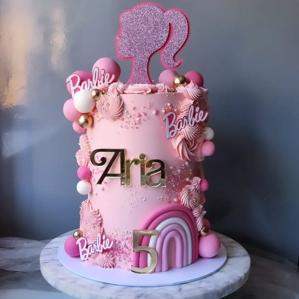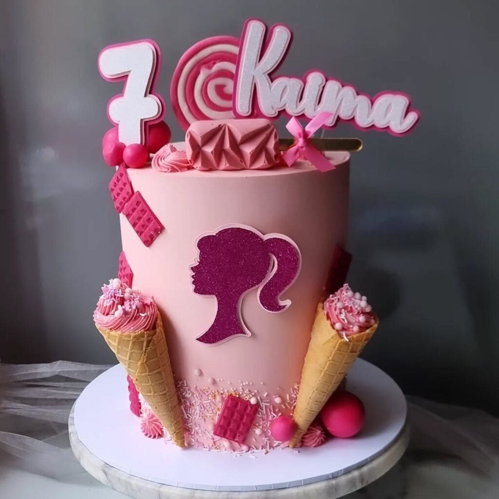 This beautiful cake is a centerpiece among Barbie birthday party ideas. The tall, light pink cake features a classic Barbie silhouette topper that shimmers with glitter. It’s a true work of art.