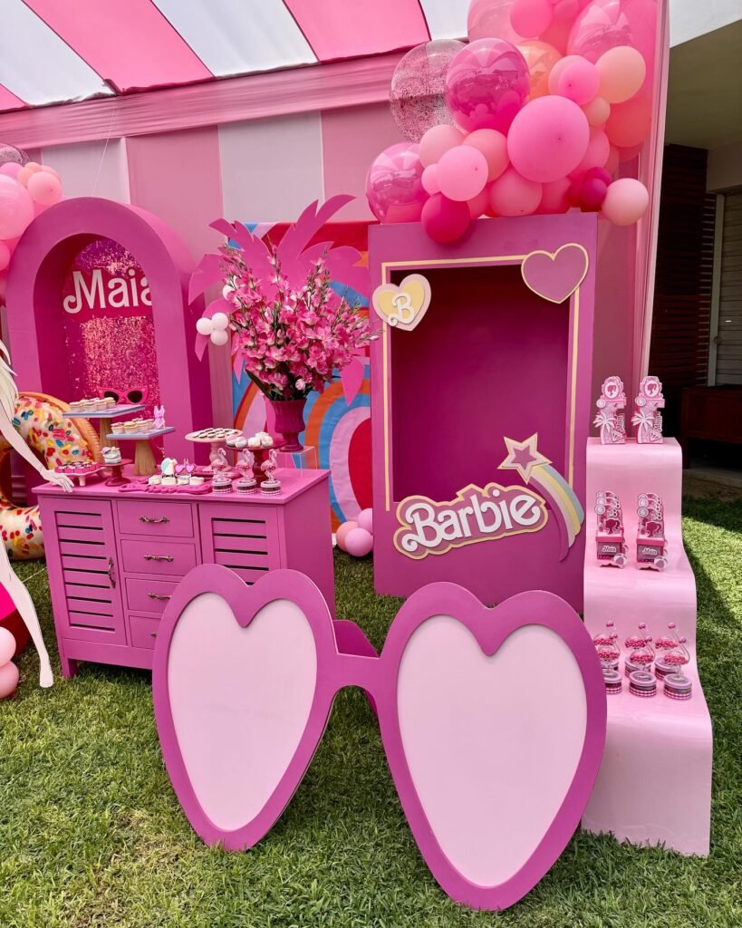 This backyard party provides truly captivating Barbie birthday party ideas. A pink-and-white striped tent creates a festive atmosphere. Large heart-shaped sunglasses and a photo frame cutout offer fun props.