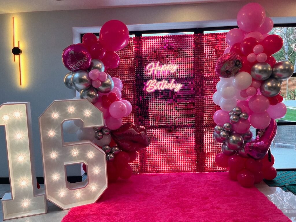 This glamorous display is one of the best Barbie birthday party ideas for a sweet sixteen. Giant, light-up numbers spell out sixteen. A vibrant, sequined backdrop shimmers under a neon “Happy Birthday” sign.