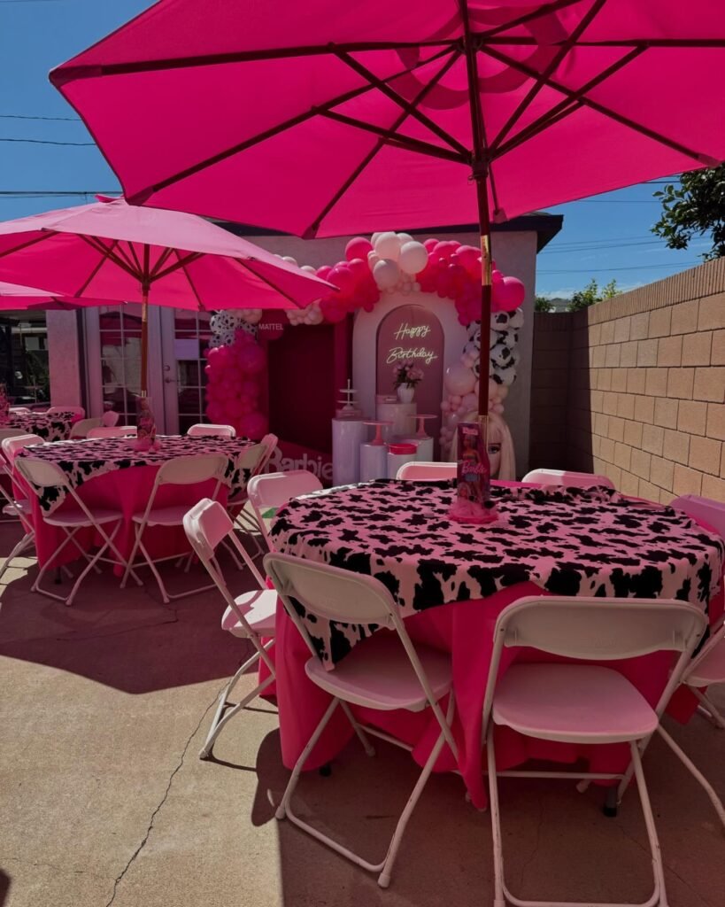 This delightful outdoor space offers fun Barbie birthday party ideas. Hot pink umbrellas provide shade over round tables. The tables are set with striking pink and black cow-print tablecloths, a playful and unique touch.