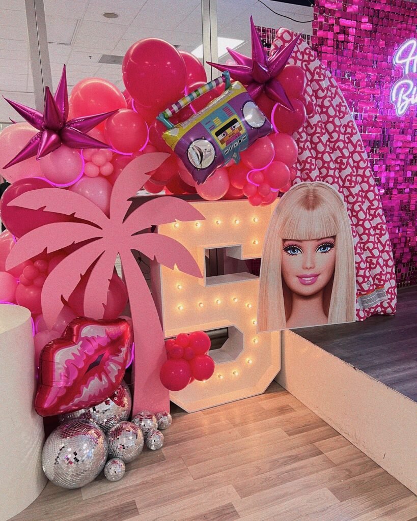 This vibrant display is full of cool Barbie birthday party ideas. A light-up number five stands out, alongside a large, fun Barbie cutout head. Disco balls and a shiny lip balloon add a retro touch.