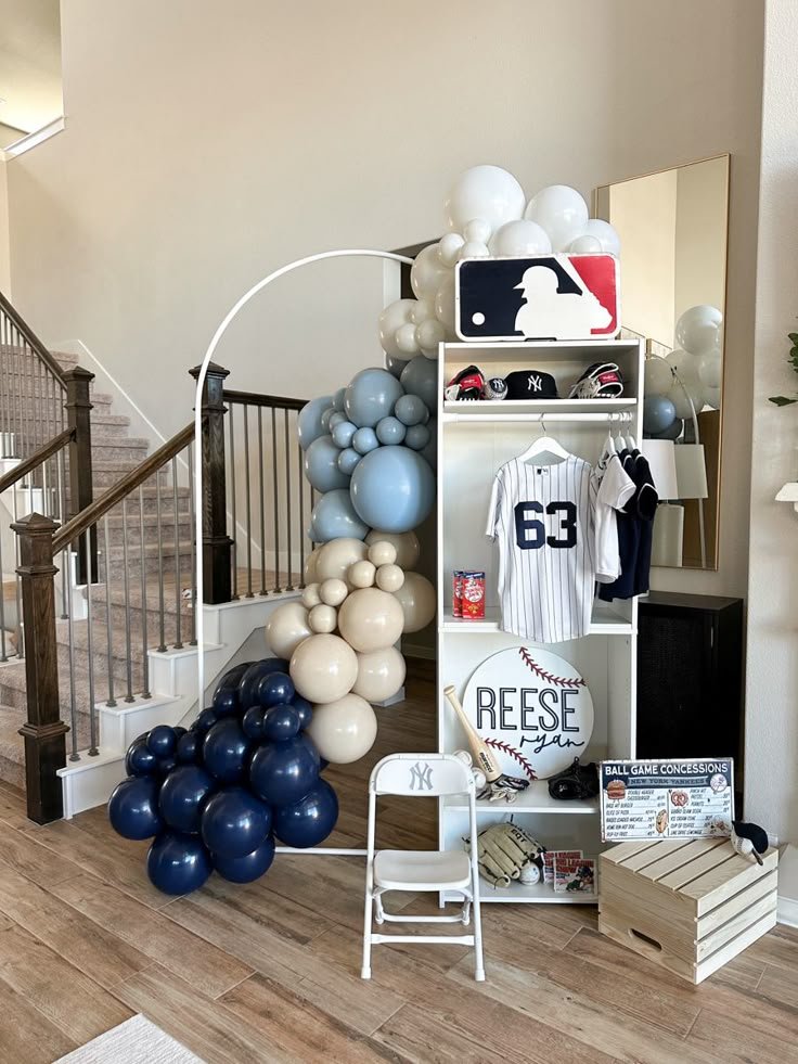 To the left, a white shelving unit is adorned with baseball-themed party favors or treats, ready for guests. This entire arrangement offers a dynamic and fun atmosphere, making it a home run for any baseball birthday party. It’s a truly memorable backdrop for photos and fun.