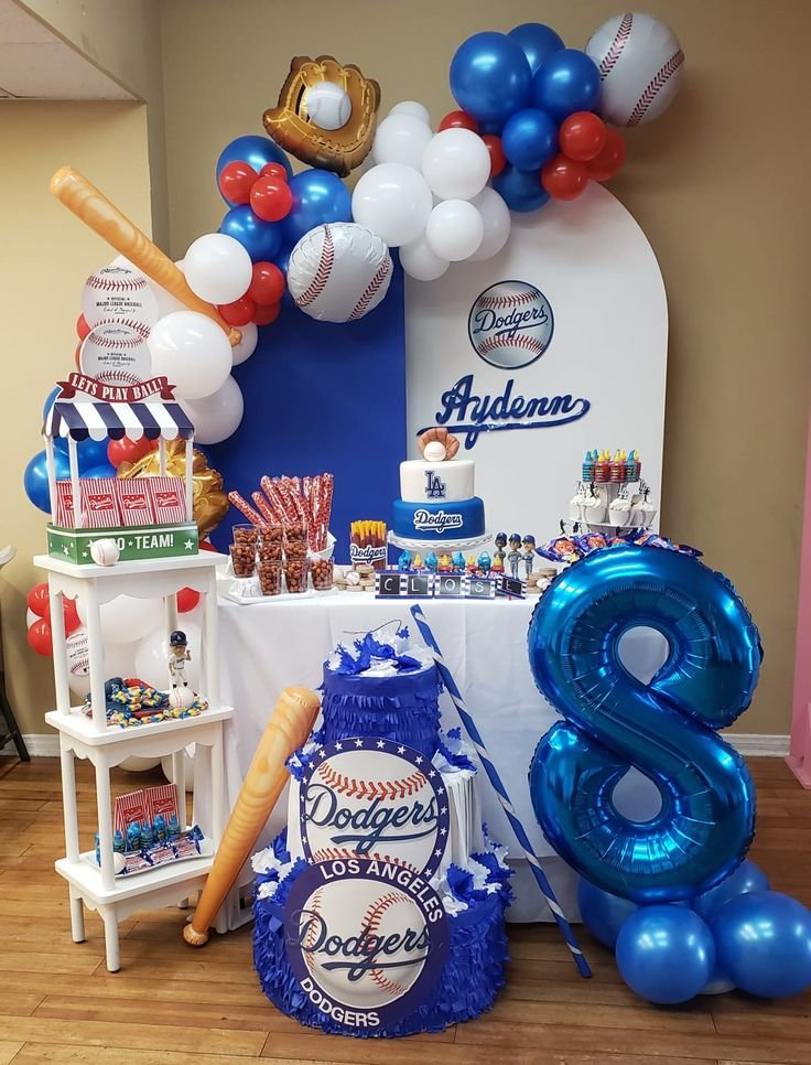 A “Dodgers” themed cake stands as the delicious centerpiece, surrounded by an array of individual treats like cupcakes and candies, all perfectly themed. A charming concession stand prop to the left holds snacks and favors. A large blue number “8” balloon prominently marks the birthday age.