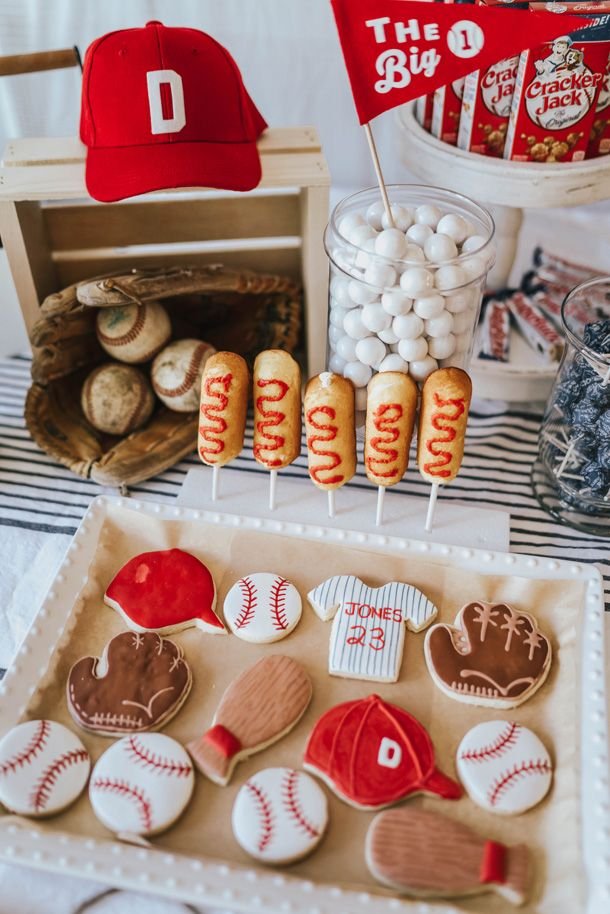 This delightful spread offers a fantastic array of treats, truly enhancing any baseball birthday party celebration. A prominent tray showcases beautifully decorated cookies in various baseball shapes: classic baseballs, detailed mitts, bats, and even a miniature jersey personalized with “Jones 23.” A cute red baseball cap cookie adds another playful element.