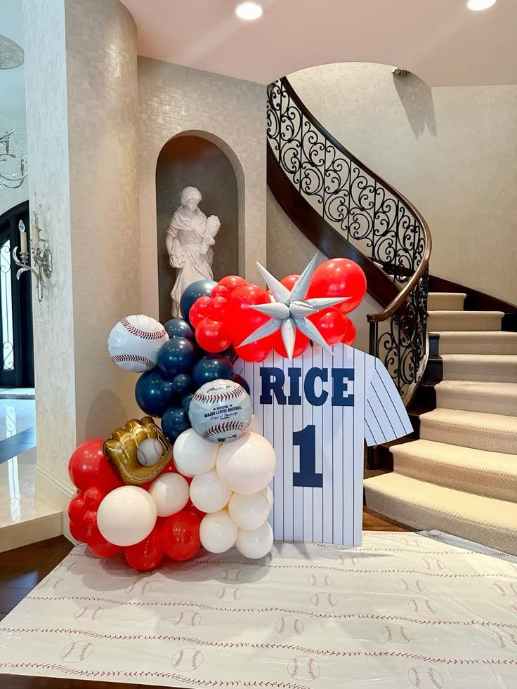 Accompanying the jersey is a vibrant and dynamic balloon arrangement in shades of red, white, and navy blue, accented with realistic baseball-shaped balloons. A shimmering silver starburst balloon adds a celebratory pop to the cluster. You can also spot a golden baseball glove balloon, adding another authentic touch.