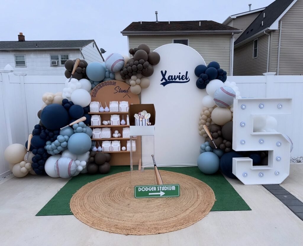 Get ready to hit it out of the park with this amazing baseball birthday party setup. A custom white backdrop proudly displays the birthday boy’s name, Xaviel, in a classic baseball script. Flanking the centerpiece are impressive balloon arches, featuring shades of dusty blue, cream, and rich chocolate, interspersed with delightful baseball-themed accents.