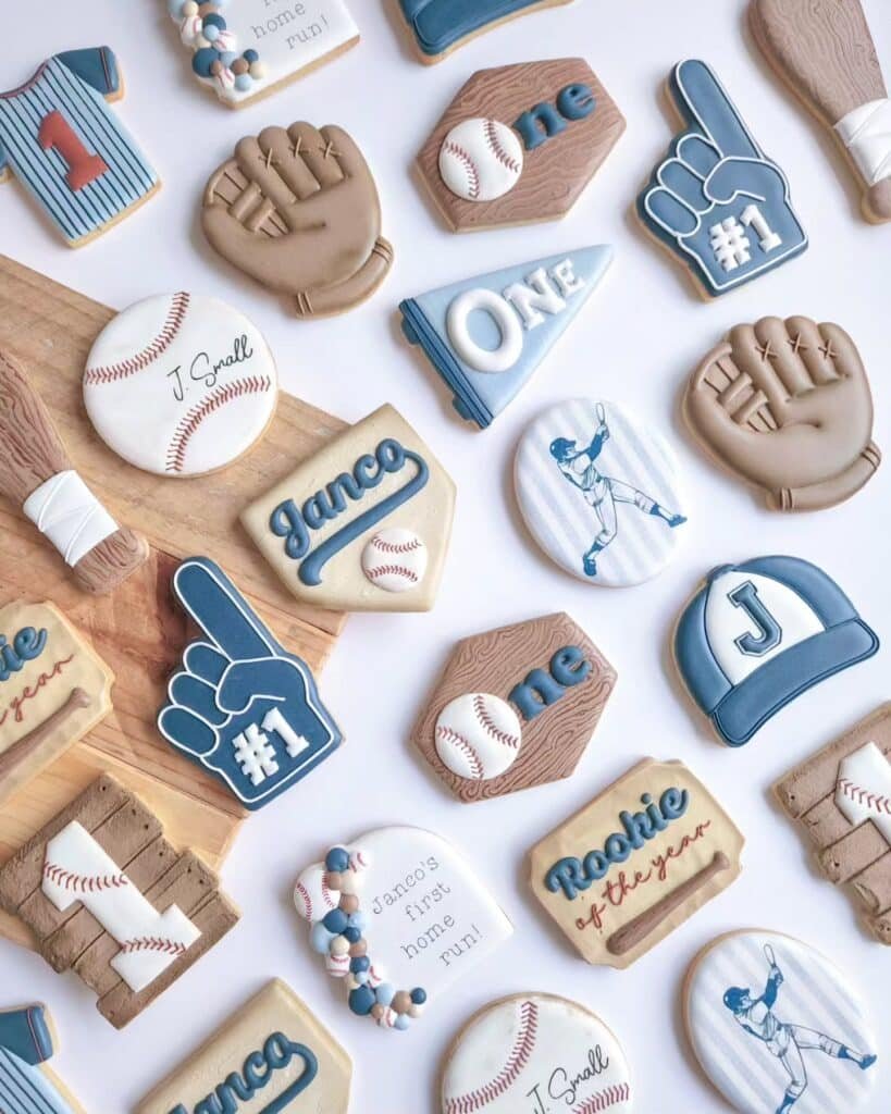 Many cookies are personalized with names like “Janco” or “J Small,” adding a special touch. You will also find playful messages such as “Rookie of the Year” and “Janco’s first home run!” The color palette of blues, creams, and browns truly captures the essence of the game.
