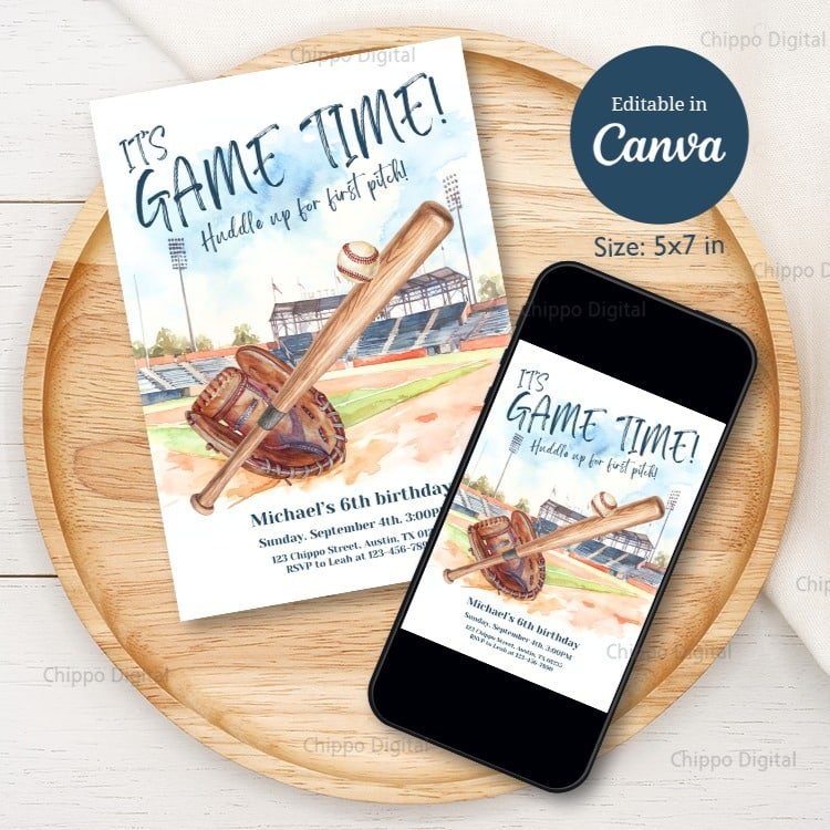 This charming invitation truly sets the stage for an exciting baseball birthday party. The design features a beautifully rendered watercolor illustration of a baseball field, complete with a bat, ball, and glove in the foreground, evoking the spirit of the game. The playful phrase “IT’S GAME TIME! Huddle up for first pitch!” immediately creates anticipation.