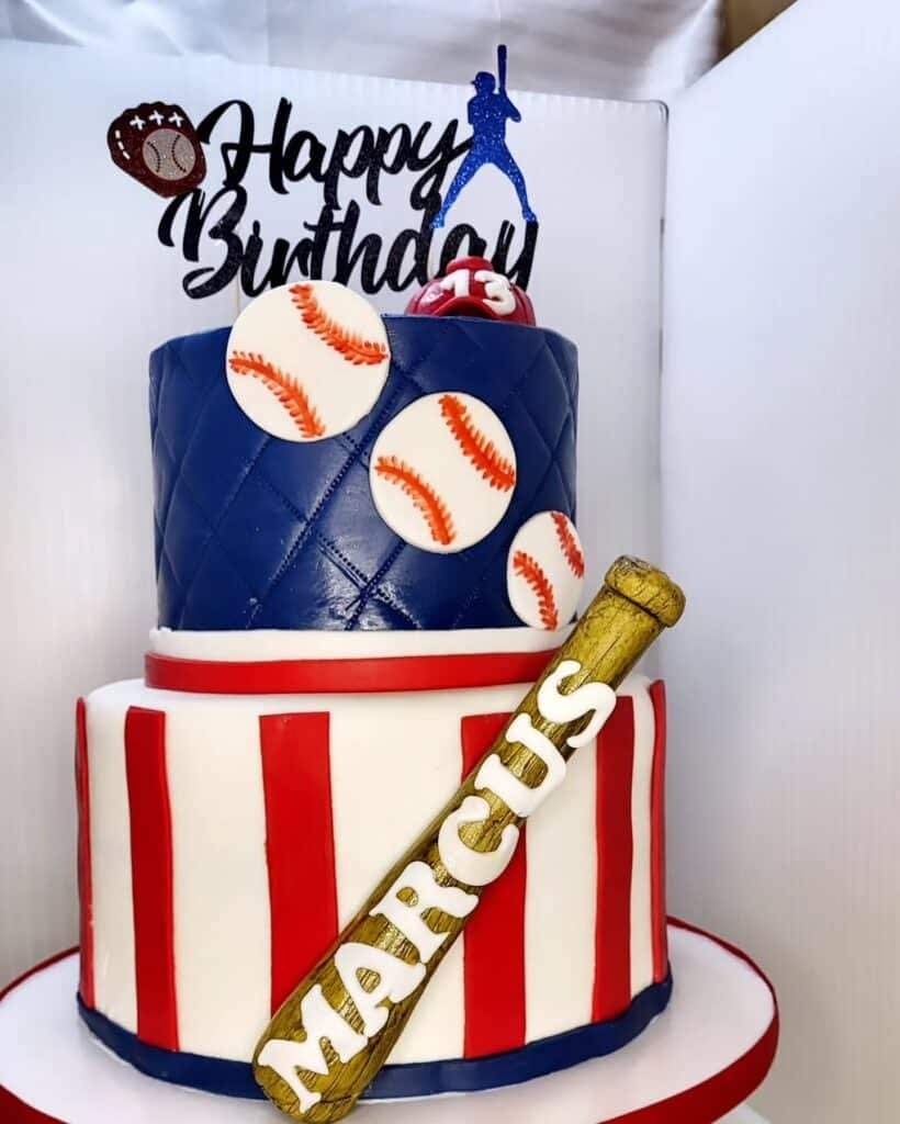 This incredible two-tiered cake is a showstopper for any baseball birthday party, celebrating in true style. The bottom tier features bold red and white stripes, reminiscent of classic baseball uniforms, with a dark blue base trim. A golden baseball bat, proudly displaying “MARCUS” in white letters, is playfully angled across this tier.