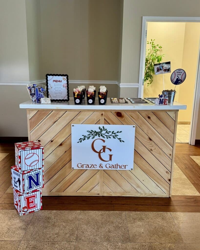 Here is a wonderful concession stand setup, adding a charming and functional element to any baseball birthday party. The wooden counter with its herringbone design brings a rustic yet refined touch. It prominently features the “Graze & Gather” logo, suggesting delicious treats await.