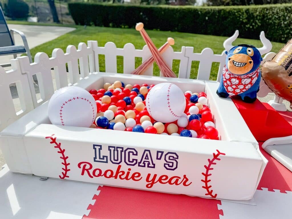 In the background, a pair of crossed baseball bats peek out, further reinforcing the theme. This ball pit provides a safe and engaging space for the youngest guests at a baseball birthday party, making their celebration extra memorable and fun. It’s a wonderful photo opportunity too.