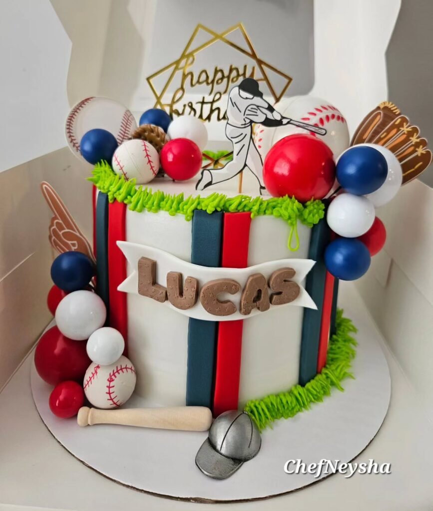 A charming banner proudly displays “LUCAS” in fun, textured letters, making it uniquely personal for the birthday boy. The cake is wonderfully decorated with a variety of baseball-themed accents. You will spot realistic mini baseballs, red and blue spheres, a tiny baseball bat, and a detailed catcher’s mitt.