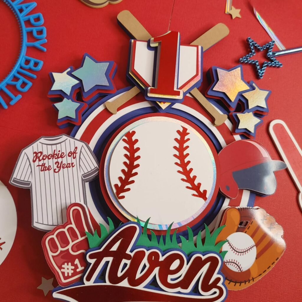 The topper proudly displays the number “1,” signifying a first birthday milestone. Surrounding it are charming baseball-themed cutouts, including a miniature jersey with “Rookie of the Year” emblazoned on it, a tiny helmet, a catcher’s mitt, and a lively “1” foam finger. Shimmering stars provide a celebratory sparkle.