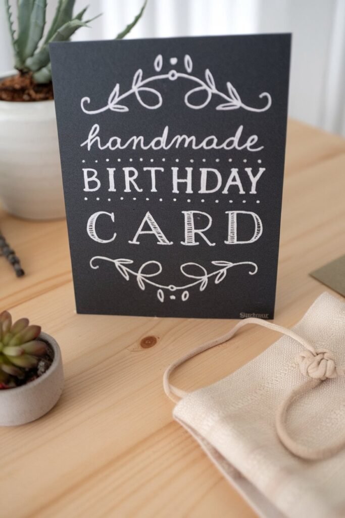 Bold white lettering transforms black cardstock into this striking birthday card idea for friends. The decorative flourishes frame “handmade birthday card” with elegant botanical touches that feel both modern and timeless. Hand-lettered styling gives each word personality and visual weight.