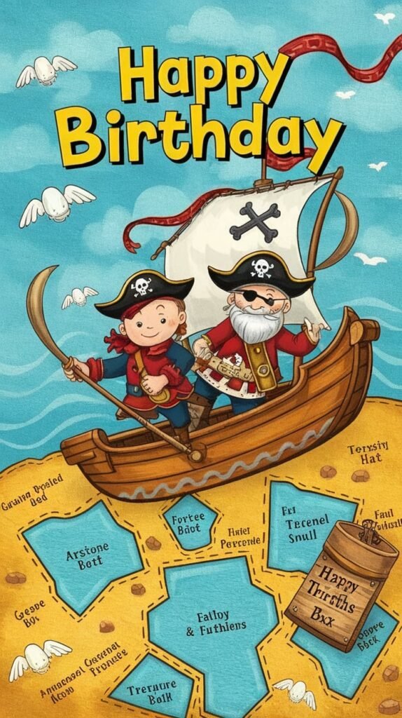 Cartoon pirates sail into birthday fun with this playful birthday card idea for friends. The treasure map background features creative island names and adventure details that spark imagination. Bright yellow lettering pops against the turquoise sky, creating instant joy and excitement.