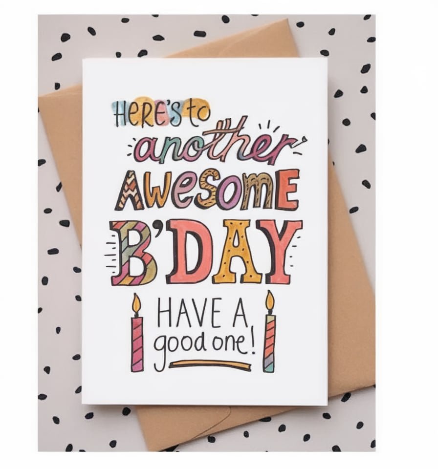 “Another awesome birthday” gets the spotlight treatment with bold colors and playful details. Tiny candles frame the sentiment while maintaining focus on the vibrant lettering. This style suits friends who love bright colors, modern calligraphy, or encouraging messages.