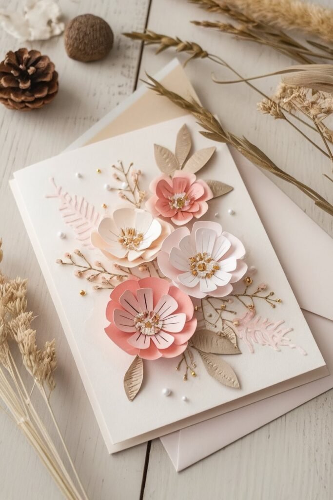 Dimensional paper flowers take center stage in this stunning birthday card idea for friends. The coral and blush petals create depth through careful layering, while golden accents add luxurious sparkle.