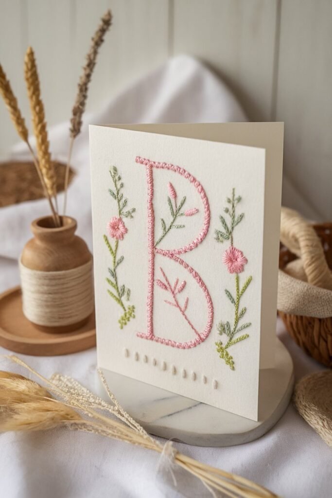 Hand embroidery brings personal warmth to this birthday card idea for friends. The decorative letter ‘B’ blooms with pink and green stitched flowers, creating texture you can actually feel. Traditional embroidery techniques meet modern card design in this delightful fusion.