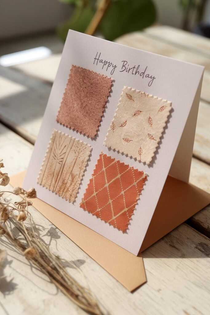 Textile elements make this birthday card idea for friends absolutely unique. Four fabric squares showcase different patterns and textures, from solid rust to delicate leaf prints. The pinking shear edges add authentic craft charm while preventing fraying.