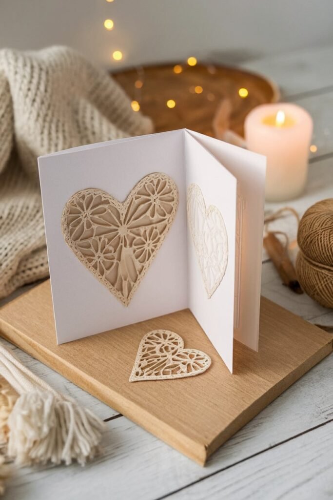 Laser-cut precision meets heartfelt sentiment in this birthday card idea for friends. The decorative heart window reveals matching patterns inside, creating surprise and delight when opened. Neutral tones keep the focus on the beautiful cut-work details.