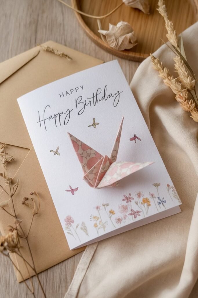 Paper folding artistry shines in this birthday card idea for friends. The delicate origami crane appears to flutter above a garden of tiny painted flowers. Pink and coral tones create harmony between the folded element and illustrated background.